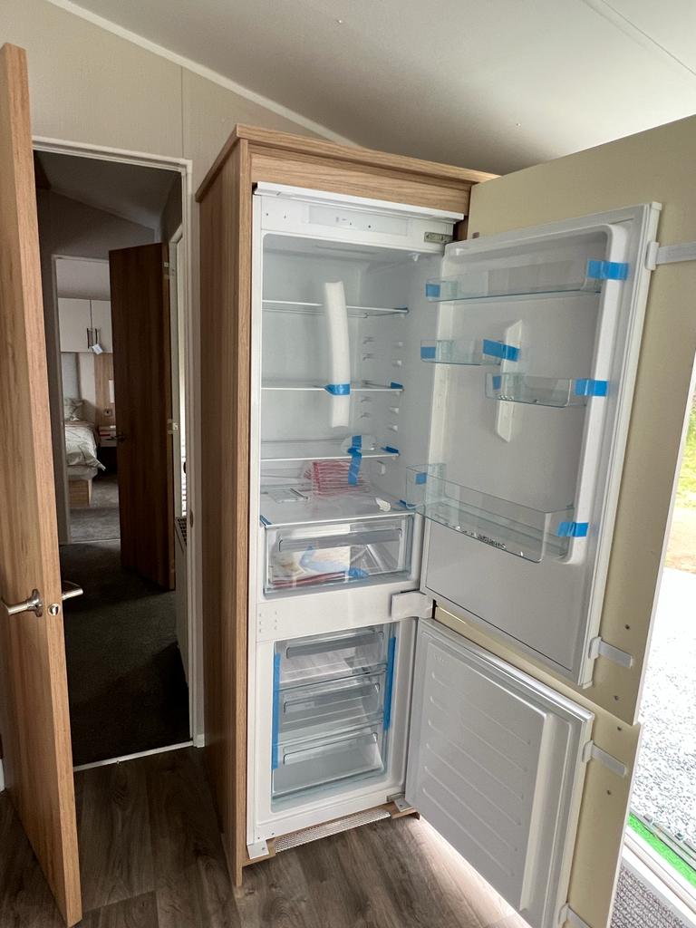 A Belling oven with five burner hob is fitted, along with an 800 watt microwave, plus an integrated fridge/freezer.